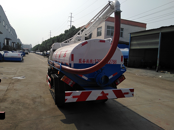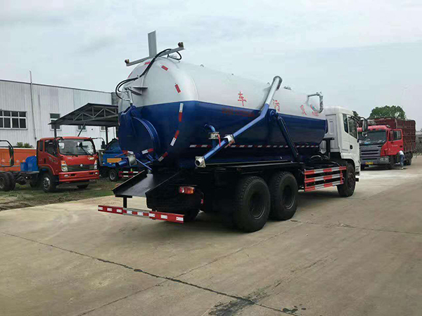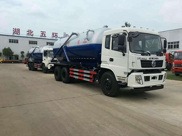 吸污車專用部分由取力器、傳動軸、真空吸污泵、壓力罐體、液壓部分,管網(wǎng)系統(tǒng)、真空壓力表、視糞窗、洗手裝置等組成,隨車配置大功率真空吸污泵和優(yōu)質(zhì)液壓系統(tǒng),罐體封頭一次壓鑄成型、罐體可后開、雙頂自卸。罐內(nèi)污物可通過后蓋直接傾倒,具有真空度高(比吸糞車的吸力更大)、噸位大、效率高、用途更廣泛的特點。