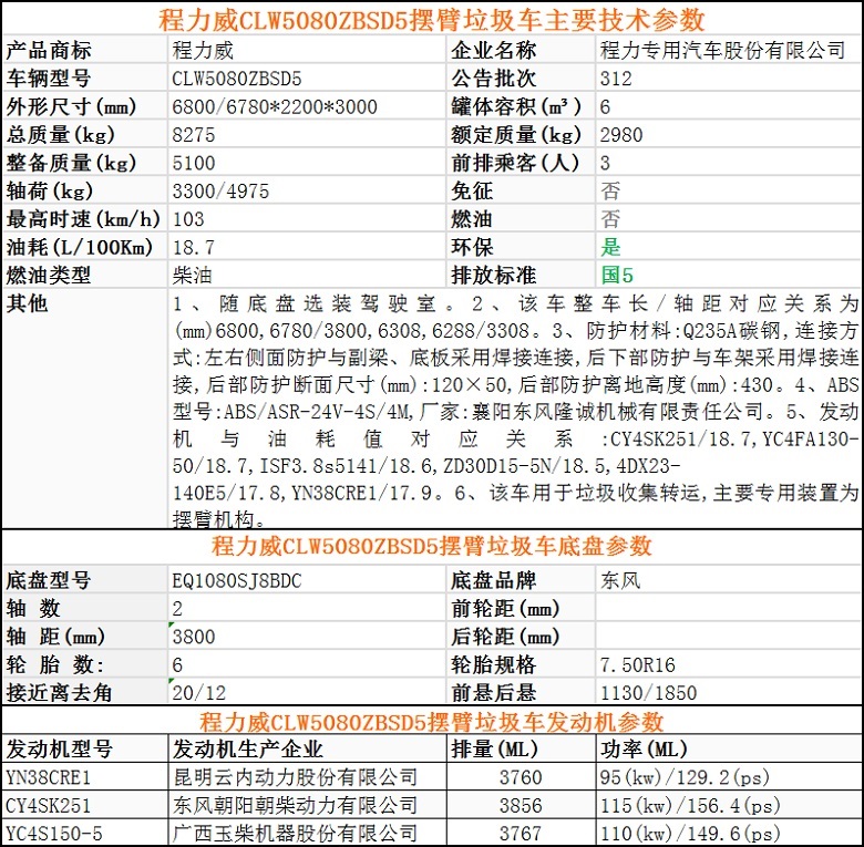 采用東風原裝底盤,EQ1110SJ8BDC 國五 多利卡D7,脂玉白,軸距3800,2030單排前翻轉(zhuǎn)駕駛室,發(fā)動機國五朝柴 CY4SK251,156馬力;一汽錫柴4DX23-140E5,140馬力,變速箱6A120(6TS55)萬里揚6擋變速箱,前后橋2.2/4.2T(2.5/5.5T配8.25R16),192mm寬的變截式大梁,板簧8/10+7,輪胎8.25R16鋼絲胎、方向助力、斷氣剎、電動車窗、中控鎖、ABS、帶原廠空調(diào)。