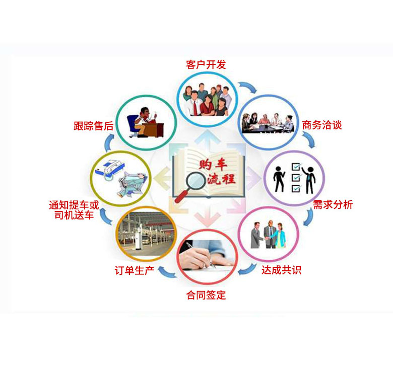 2、購車流程: | 1、咨詢洽談(電話洽談或來廠考察洽談) 2、簽訂汽車購銷合同(傳真、郵遞或者來廠簽訂) 3、我廠按時按質(zhì)生產(chǎn) 4、交付驗收 >>點擊查看詳細內(nèi)容 |