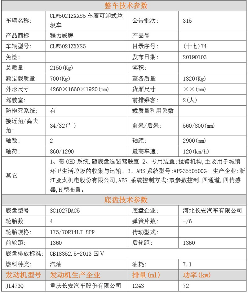 長(zhǎng)安藍(lán)牌 3方鉤臂垃圾車 售后服務(wù)說明 | |