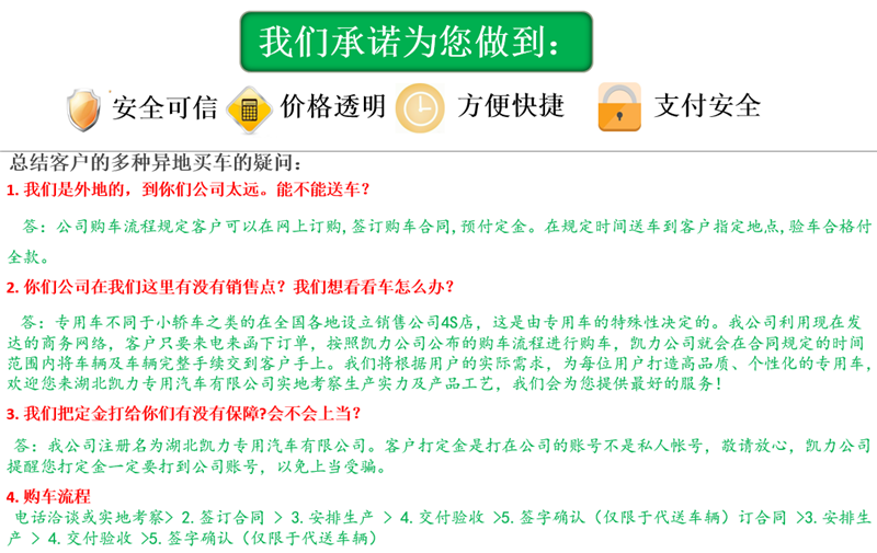 2、購車流程: | 1、咨詢洽談(電話洽談或來廠考察洽談) 2、簽訂汽車購銷合同(傳真、郵遞或者來廠簽訂) 3、我廠按時按質生產 4、交付驗收 >>點擊查看詳細內容 |
