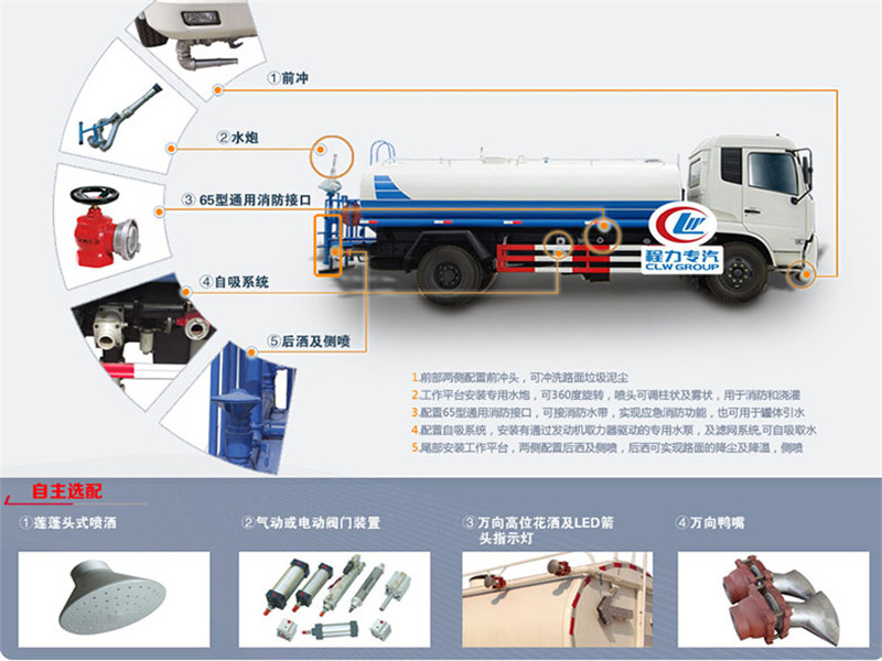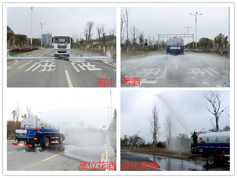 前噴后灑,前裝有鴨形噴嘴或圓頭沖嘴,后面裝有圓柱開灑水噴嘴或蓮蓬頭噴嘴,后部有一工作平臺,裝配有高壓水炮。后部還可裝8個(gè)噴嘴(選裝)噴水器一般用于沖洗街道。
