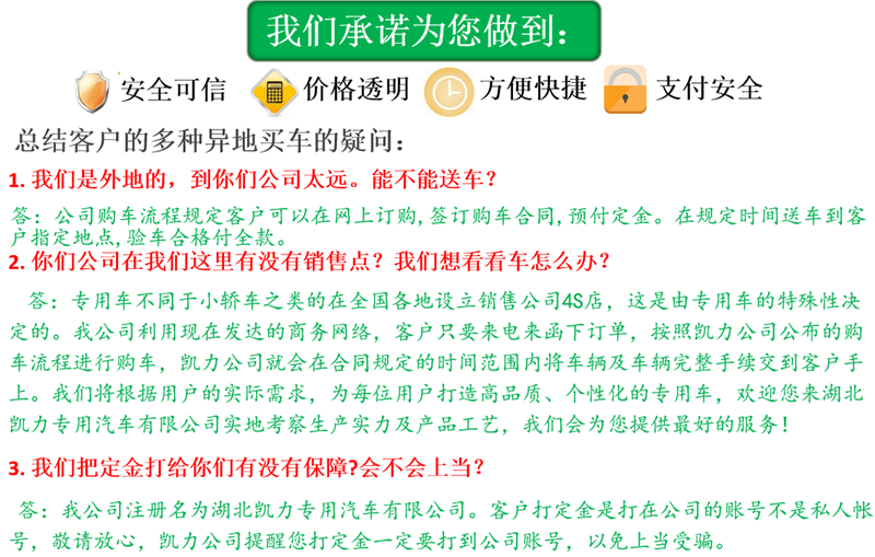 2、購(gòu)車流程: | 1、咨詢洽談(電話洽談或來(lái)廠考察洽談) 2、簽訂汽車購(gòu)銷合同(傳真、郵遞或者來(lái)廠簽訂) 3、我廠按時(shí)按質(zhì)生產(chǎn) 4、交付驗(yàn)收 >>點(diǎn)擊查看詳細(xì)內(nèi)容 |