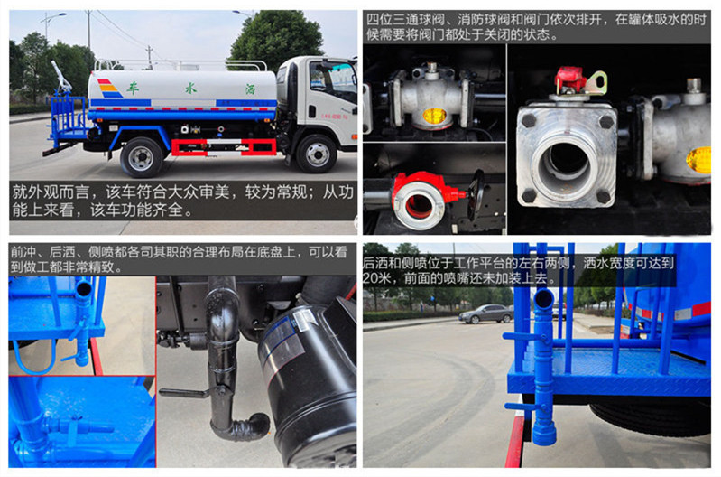 前噴后灑,前裝有鴨形噴嘴或圓頭沖嘴,后面裝有圓柱開灑水噴嘴或蓮蓬頭噴嘴,后部有一工作平臺,裝配有高壓水炮。后部還可裝8個噴嘴(選裝)噴水器一般用于沖洗街道。